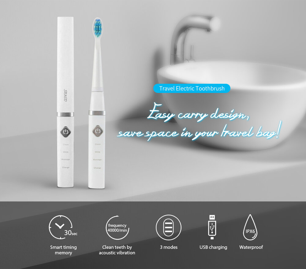 Seago – бренд із великою історією. Компанія випускає понад 30 різних моделей звукових зубних щіток. Тонка, легка, якісна звукова зубна щітка. 4 режими роботи, таймер на 2 хвилини, водонепроникна. Місткість акумулятора: 260mA. У комплекті зі щіткою йдуть 2 змінні насадки. Зубна щітка закривається дорожнім ковпачком.