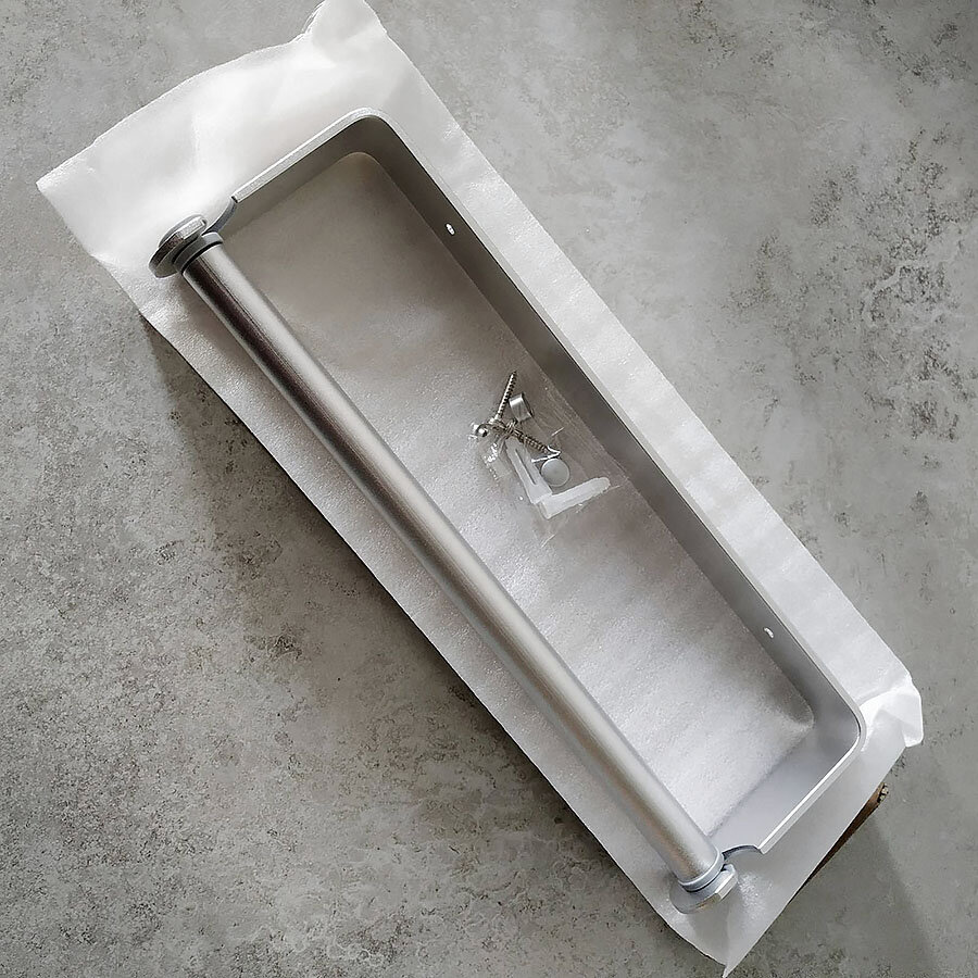 Универсальный держатель бумажных рулонных полотенец. Изготовлен из алюминия. Изделие может крепиться вертикально, горизонтально или верх ногами. Не боится коррозии. Крепление - шурупы + дюбеля (идут в комплекте).