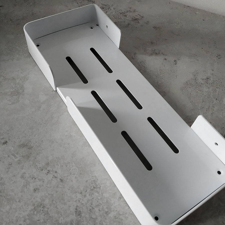 Полиця для ванної виготовлена з алюмінію, стійка до дії вологи, не іржавіє. Полиця має сучасний дизайн (модерн, лофт), що гармонійно поєднується з більшістю дизайнерських рішень при облаштуванні ванної кімнати. Покриття – міцний ґрунт + фарба.