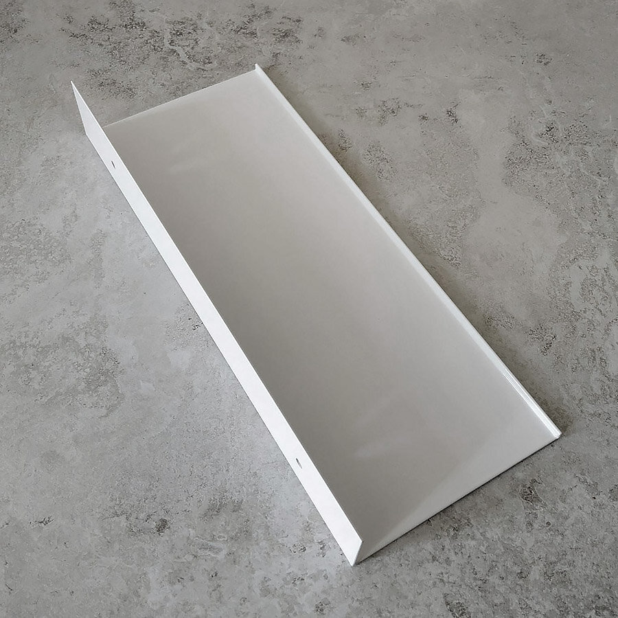 Полка для ванной из алюминия. Полка может крепиться обычно и наоборот (в зависимости от дизайнерских предпочтений), гармонично сочетается с большинством дизайнерских решений при обустройстве ванной комнаты. Прорези - отсутствуют, поверхность плоская. Дизайнерская линейка полок от IwConcept. Покрытие - прочный грунт + белая глянцевая краска.