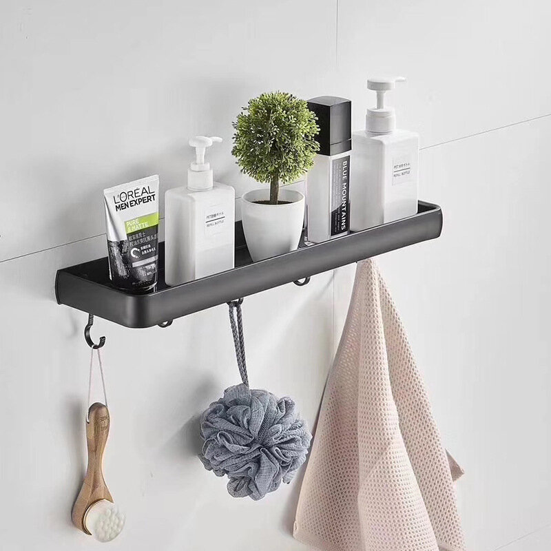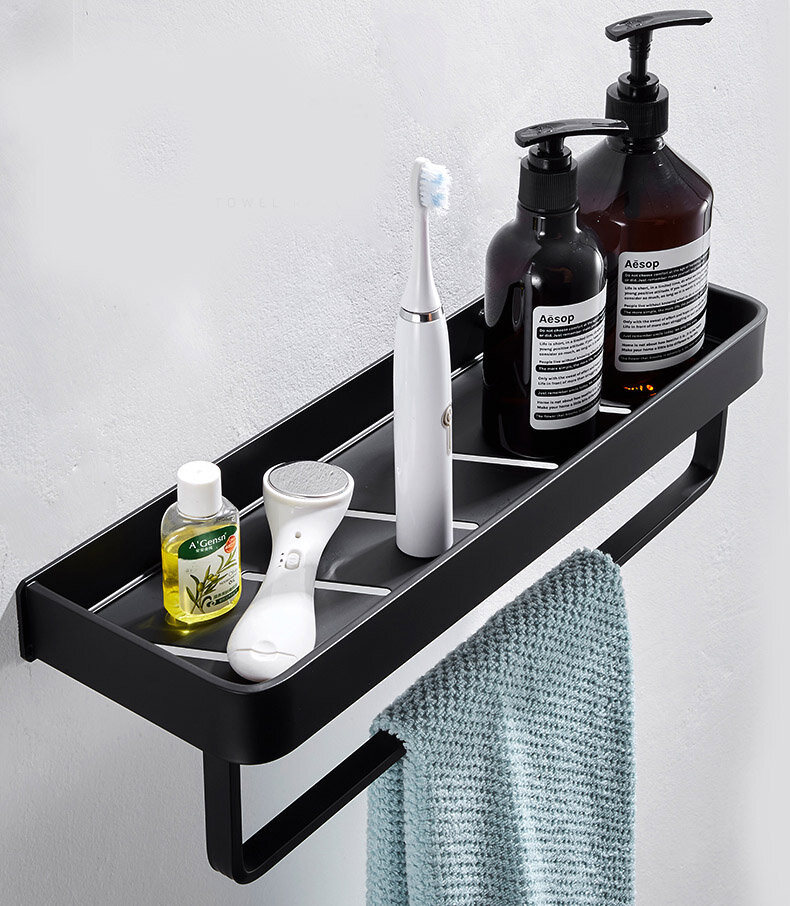 Полиця для ванної виготовлена з алюмінію, стійка до дії вологи, не іржавіє. Внизу кріпляться гачки та вішалка. Полиця має сучасний дизайн (модерн, лофт), що гармонійно поєднується з більшістю дизайнерських рішень при облаштуванні ванної кімнати. Покриття – фарба.