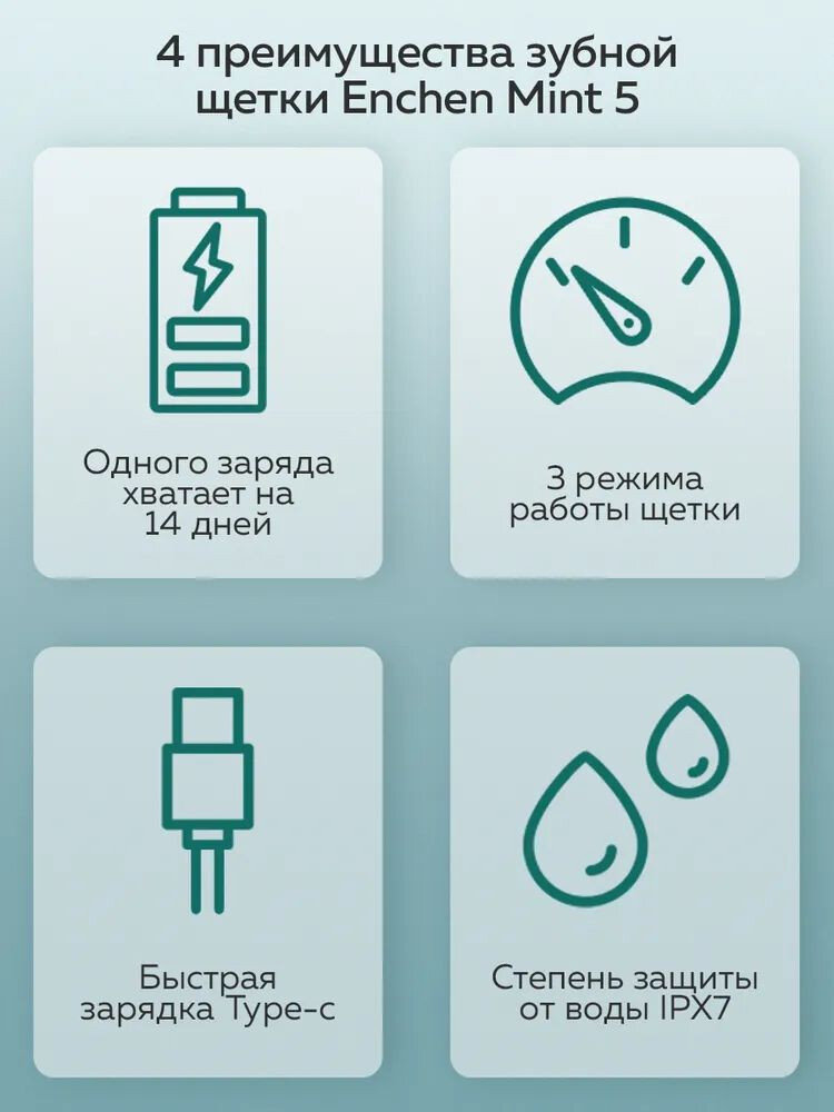 Enchen Mint 5 представляет собой электрическую зубную щетку, которая с легкостью очистит всю полость рта. Модель обладает степенью защиты IPX7, благодаря чему ей не страшны воздействия воды и влаги.