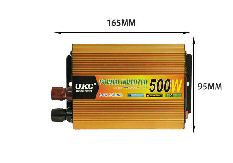 Інвертор в алюмінієвому тепловідвідному корпусі максимальною потужністю 500 Ватт. Є USB вихід. Живлення від акумулятора чи сонячної панелі. Є захист від короткого замикання, перевантаження, високої і низької напруги, перегріву.