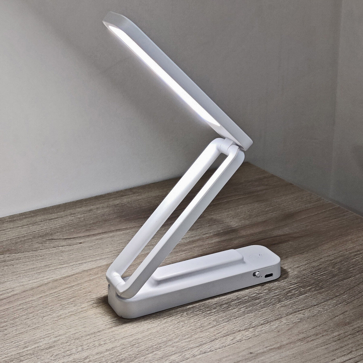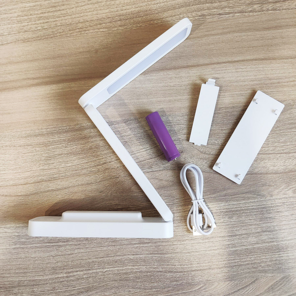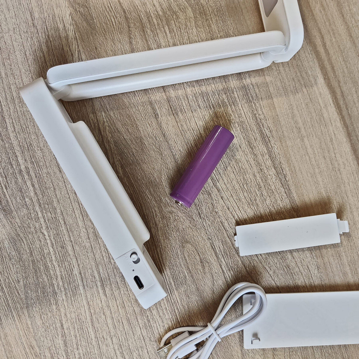 Складна настільна лампа з вбудованим джерелом світла та акумулятором. Акумулятор легко знімний – можна просто замінити.