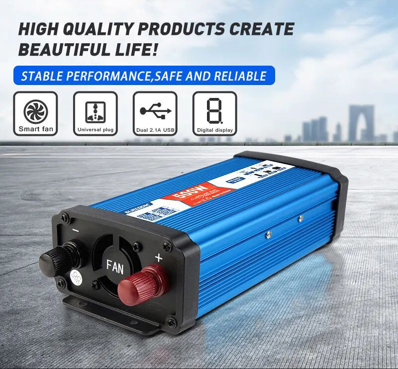 Высокочастотный инвертор в теплоотводящем корпусе мощностью 500 Ватт (пик до 1000 Ватт). Присутствует USB выход. Питание от аккумулятора или солнечной панели. Присутствует защита от короткого замыкания, перегруза, высокого и низкого напряжения, перегрева.