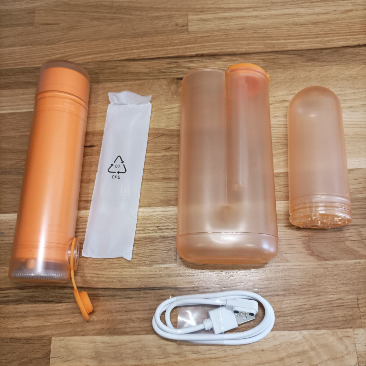Маленький розкладний іригатор. У комплекті йде 2 колби різного розміру – маленька для поїздок, велика для дому.