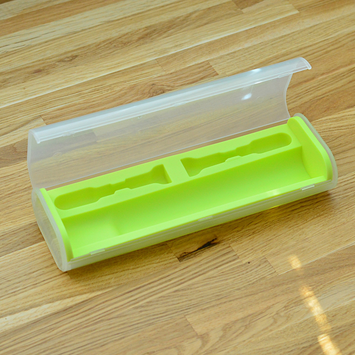 Футляр в передней части имеет уменьшенную глубину, это позволяет щетке лежать более плотно, данная форма идеально подходит для "изогнутых" электрических зубных щеток, которые выпускаются компанией Lebond. Данные зубные щетки более удобные в использовании, но подобрать для них дорожный бокс сложнее.